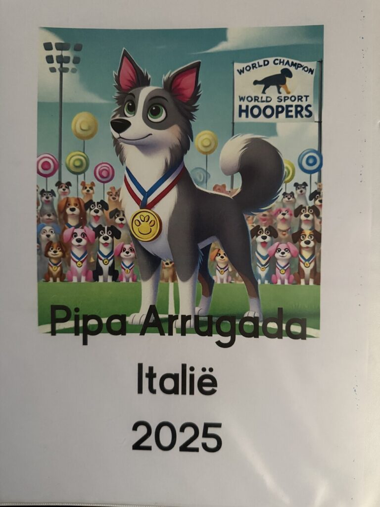 Om mezelf moed in te praten, vraag ik ChatGPT een beeld te maken om mijn werkmap te illustreren: Pipa op het WHOC. Wanneer ik het resultaat zie, schiet ik in een lachstuip. Volgens ChatGPT bengelt er trots een medaille om de nek van mijn prachthondje. Onrealistisch. Véél te hoog gegrepen. Toch print ik het beeld uit en stop het in de voorflap van mijn kaft. Elke keer we trainen, passeert dat beeld mijn netvlies.